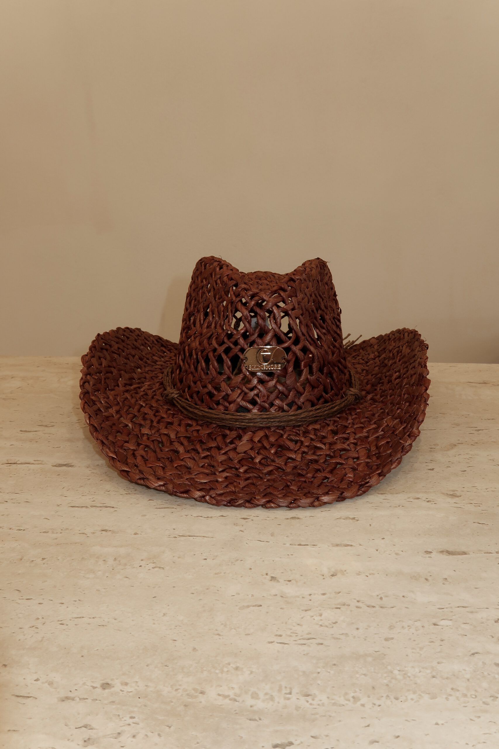 כובע קש עם פלטה ממותגת. יש אפשרות להקטנת המידה בקשירה מבפנים.