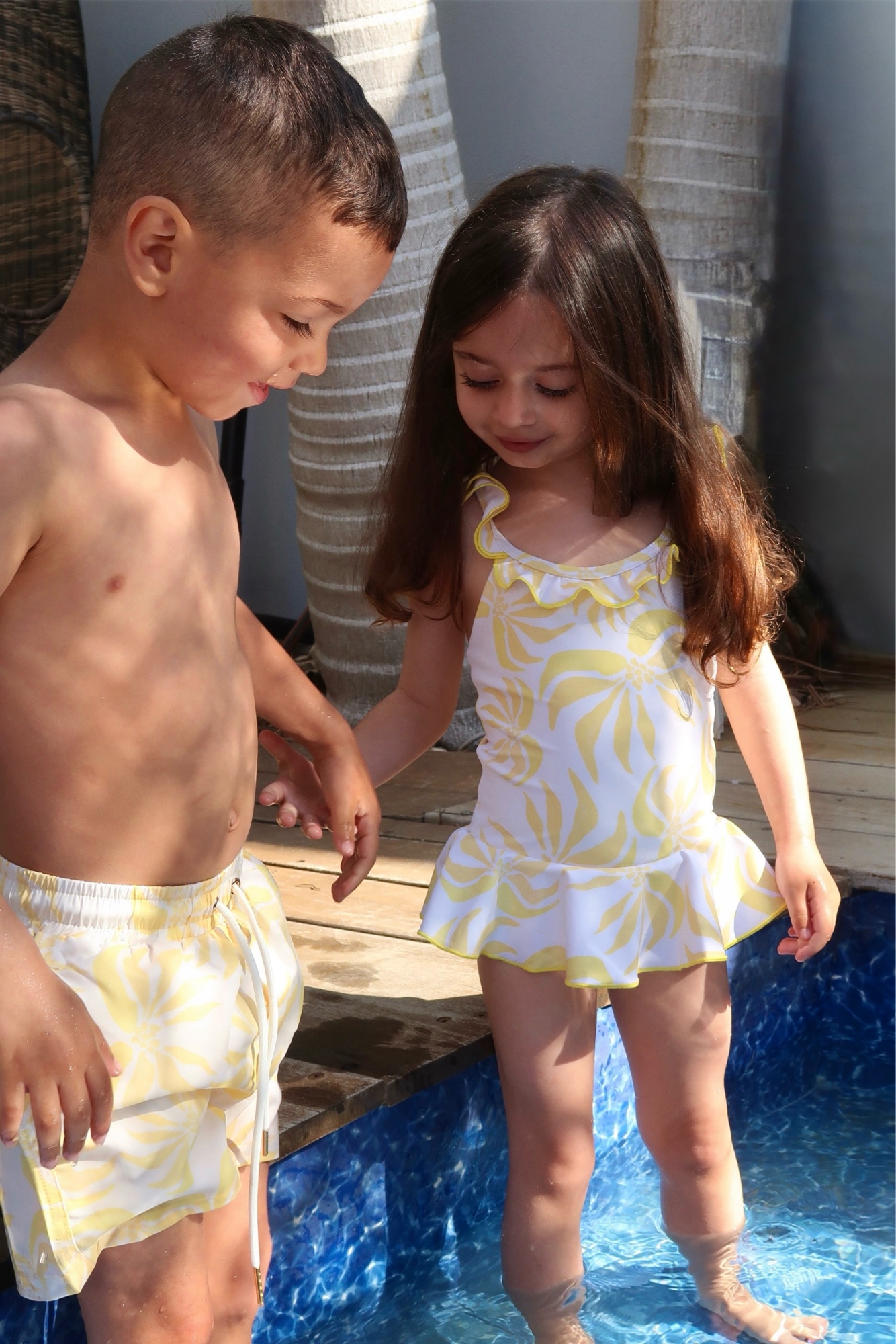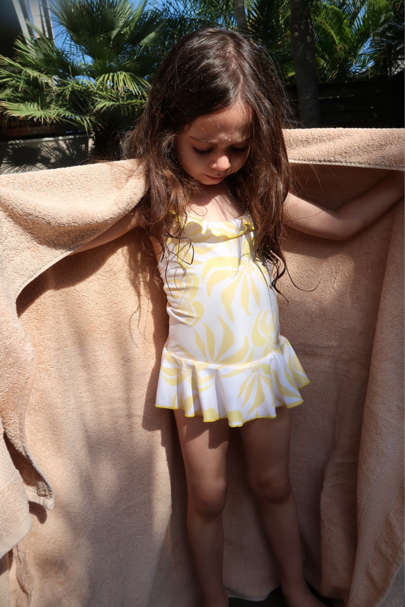 בגד ים לייקרה איכותי לילדות בהדפס קייצי תואם לקולקציית דקלים