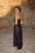 שמלת חוף מקולקציית ריזורט 2 שכבות של בד לייקרה מחורר בגזרת סטרפלס מדוייקת. על ידי סיבוב של החלק התחתון יצרנו מראה מיוחד עם מפתח רגל עמוק ומחמיא.