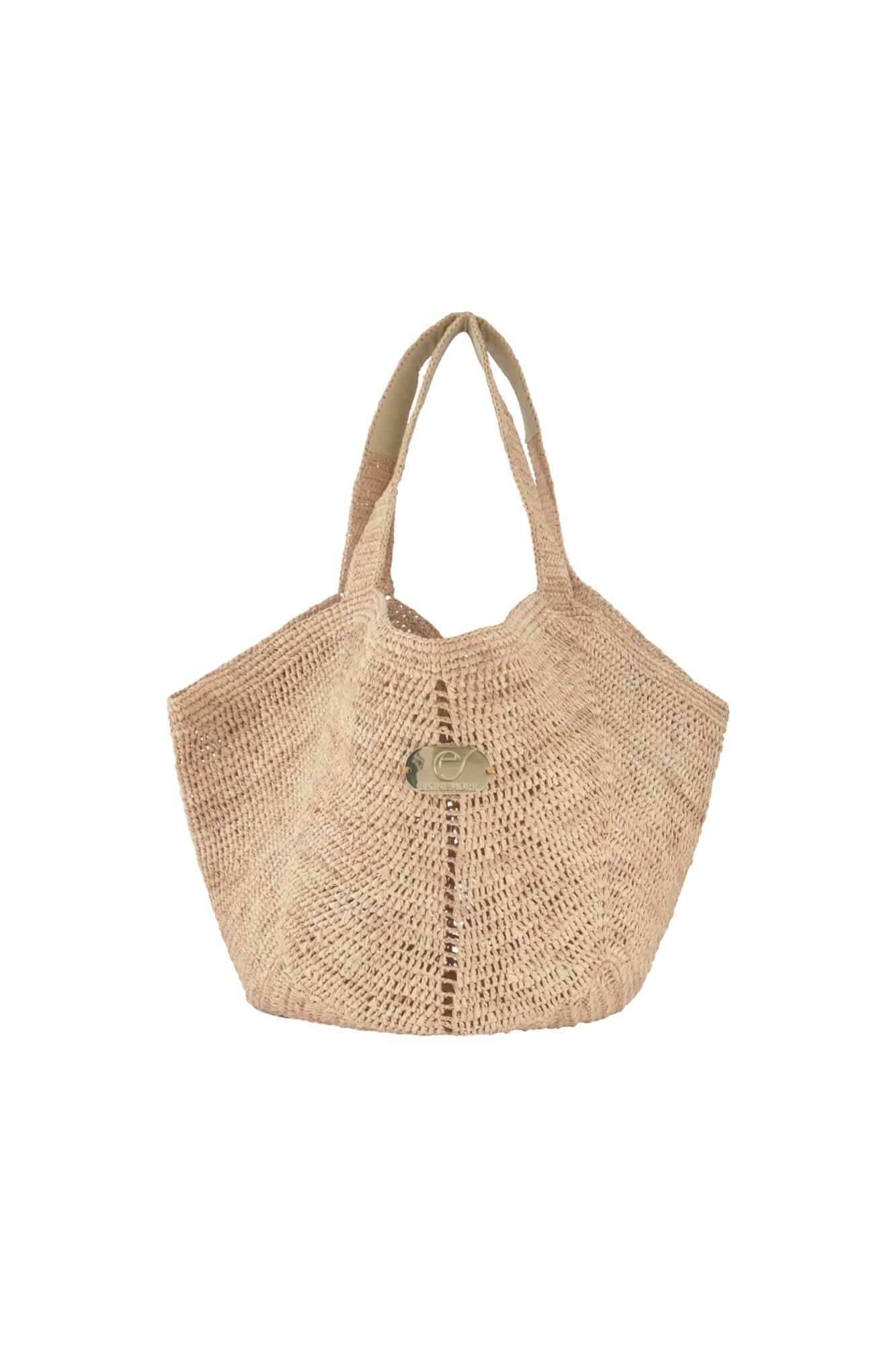 תיק חוף גודל סרוג עבודת יד בתוספת פלטת לוגו זהב.